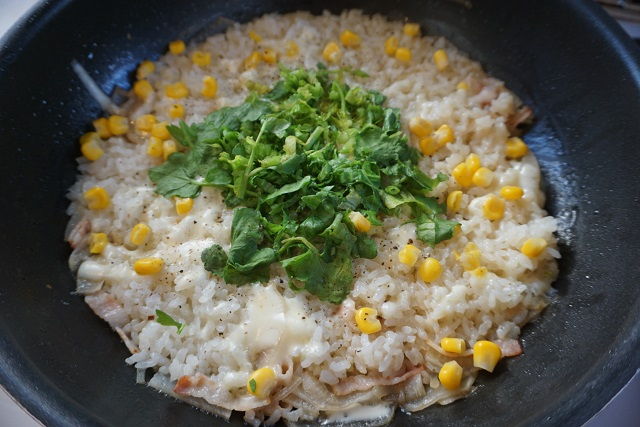 ⑤ 蓋をあけ、ピザ用チーズ、コーン、①の七草の葉の順に乗せ、蓋をして弱火で3分加熱する。