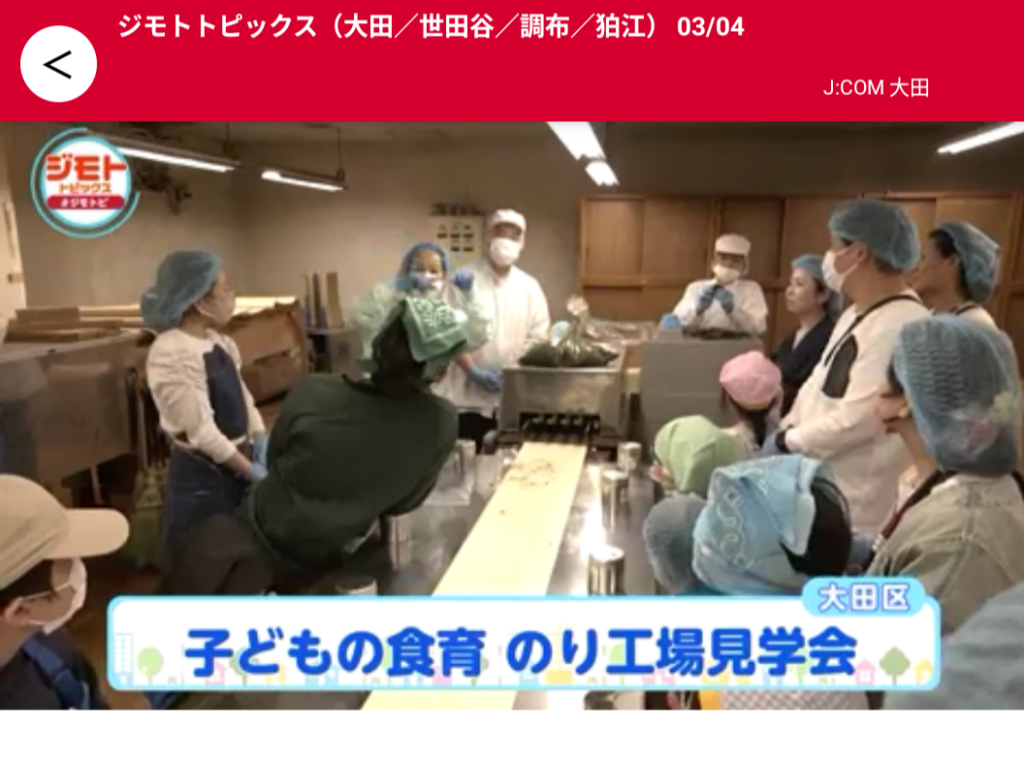 この度、2026年3月4日放送のJ:COMチャンネル『ジモトトピックス(大田/世田谷/調布/狛江)』にて、弊社が企画・運営いたしました「子どもの食育 のり工場見学会」の様子が取り上げられました。